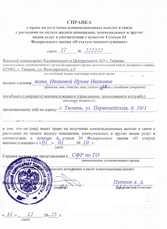 Дополнительно для назначения выплаты членам семьи военнослужащего, гражданина, призванного на военные сборы, гражданина, пребывавшего в добровольческом формировании, умерших на военной службе (а также погибших, признанных безвестно отсутствующими или умершими):