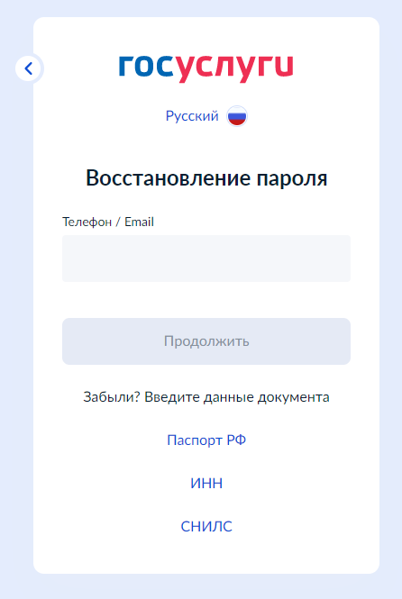 4. На странице восстановления пароля введите в поле номер мобильного телефона или адрес электронной почты (от этого зависит, куда придет код подтверждения для смены пароля). Также есть возможность восстановить пароль, указав серию и номер паспорта, данные СНИЛС или ИНН. После ввода данных нажмите «Продолжить».