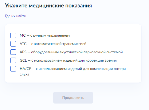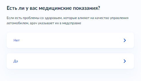 6.1.7 Укажите есть ли у вас медицинские показания к управлению транспортным средством. При выборе ответа "да", необходимо указать какие и проставить галочку в чек-боксах.