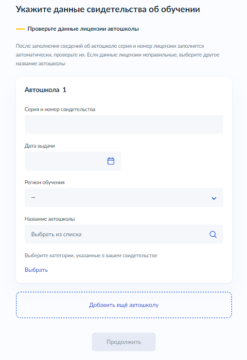 6.1.5 Укажите данные свидетельства об обучении. Обратите внимание, что нужно также выбрать категории, указанные в вашем свидетельстве.