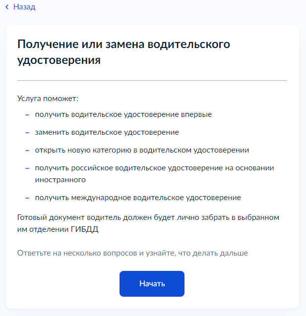 Для получения первичного водительского удостоверения выберите соответствующий раздел.