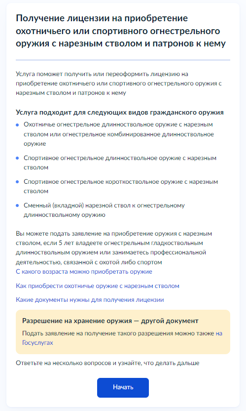 Ознакомьтесь с порядком получения услуги и нажмите «Начать», чтобы перейти к заполнению заявления.
