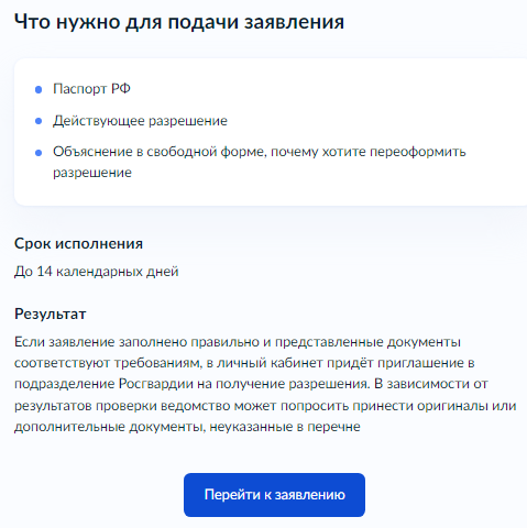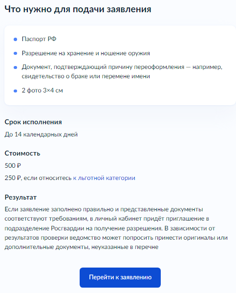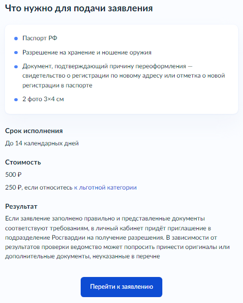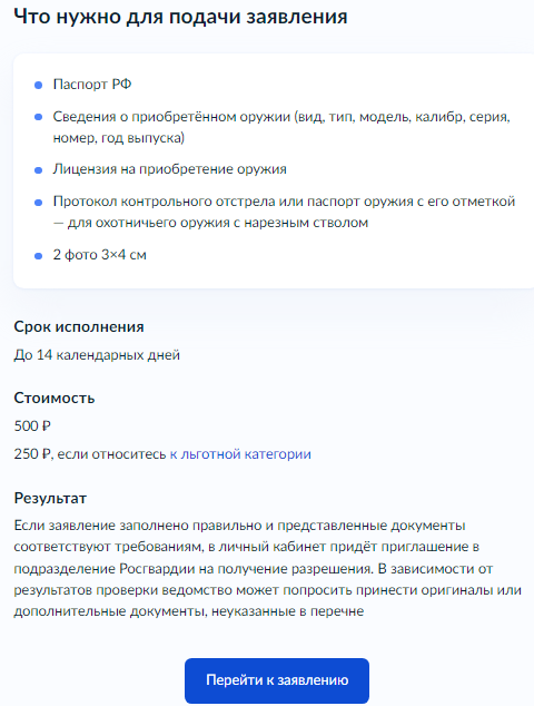 6. Ознакомьтесь с перечнем необходимых документов, для подачи заявления, сроками и стоимостью, после чего нажмите «Перейти к заявлению».