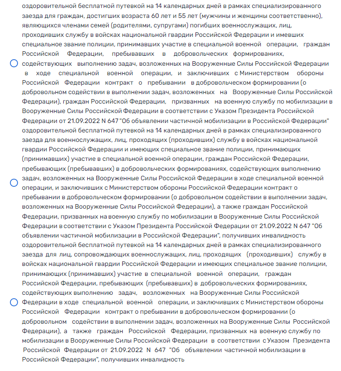 10. Граждане, достигшие возраста 60 лет и 55 лет (мужчины и женщины соответственно), являющиеся членами семей (родители, супруги) погибших военнослужащих, лиц, проходивших службу в войсках национальной гвардии РФ и имевших специальное звание полиции, принимавших участие в специальной военной операции, граждан РФ, пребывавших в добровольческих формированиях, содействующих выполнению задач, возложенных на Вооруженные Силы РФ в ходе СВО, и заключивших с Министерством обороны РФ контракт о пребывании в добровольческом формировании (о добровольном содействии в выполнении задач, возложенных на Вооруженные Силы РФ), граждан РФ, призванных на военную службу по мобилизации в Вооруженные Силы РФ в соответствии с Указом Президента РФ от 21.09.2022 N 647 "Об объявлении частичной мобилизации в РФ"