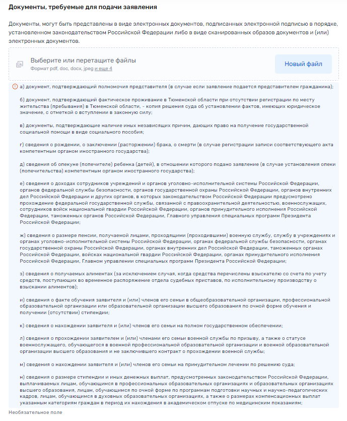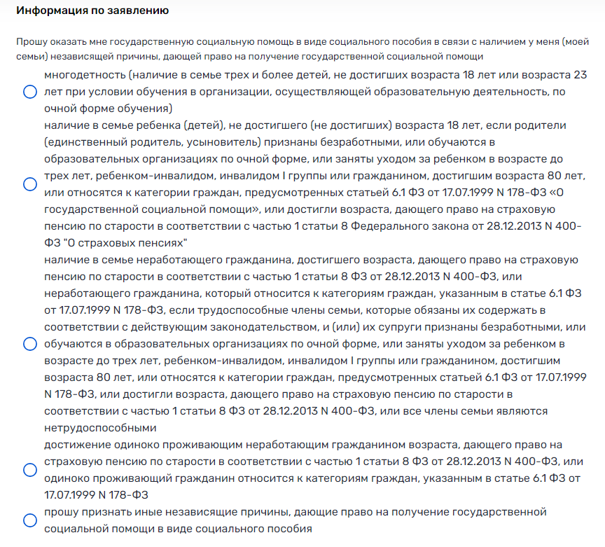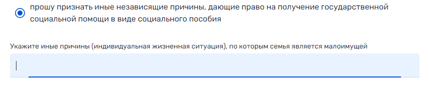 При выборе последнего пункта информации по заявлению укажите иные причины, по которым семья является малоимущей: