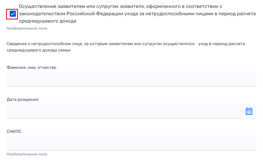 Если Вы или Ваш(а) супруг(а) осуществляете уход за нетредоспособными лицами в период расчета среднедушевого дохода, выберите это и заполните информацию о нетрудоспособном лице, за которым осуществляете уход: