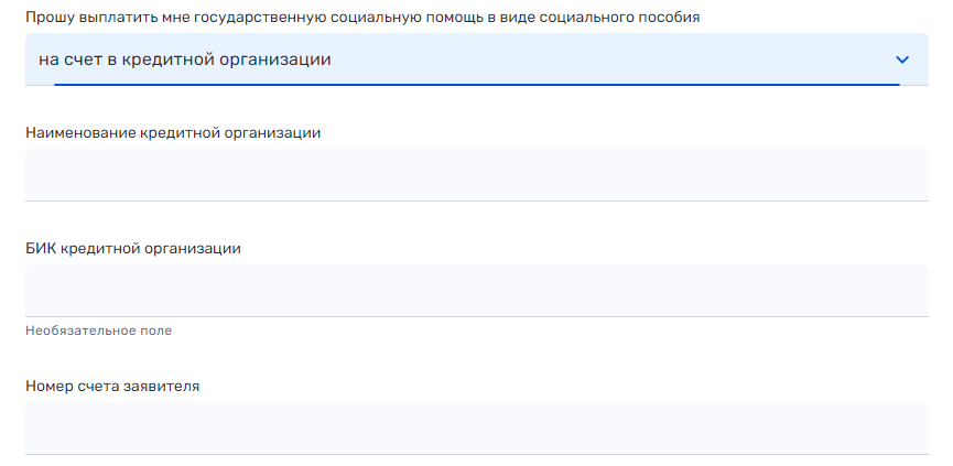 При выборе способа «На счет в кредитной организации» заполните поля: «Наименование кредитной организации», «БИК кредитной организации», «Номер счета заявителя»