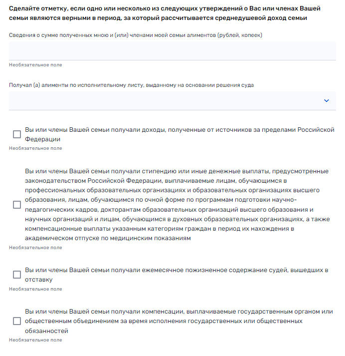 4.8. Сделайте отметку, если одно или несколько из утверждений о Вас или членах Вашей семьи является верным в период, за который рассчитывается среднедушевой доход семьи. Укажите информацию о получении алиментов: