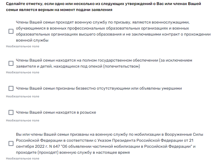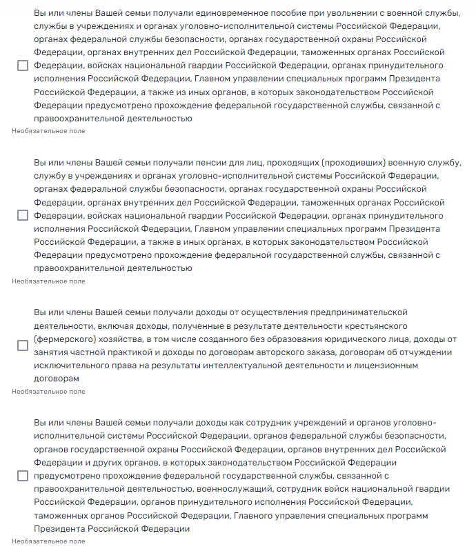 4.7. Сделайте отметку, если одно или несколько из утверждений о Вас или членах Вашей семьи является верным на момент подачи заявления: