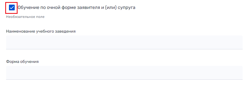 Если Вы или Ваш(а) супруг(а) являетесь студентом очной формы обучения, выберите это и заполните появившиеся поля: