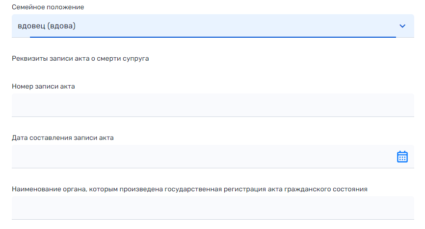 При выборе семейного положения «вдоцец (вдова)» заполните реквизиты записи акта о смерти супруга: