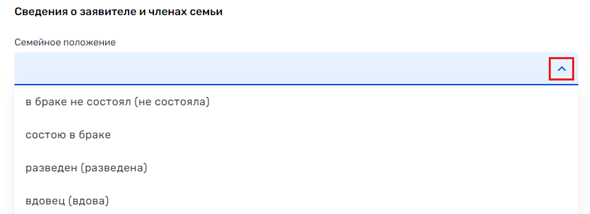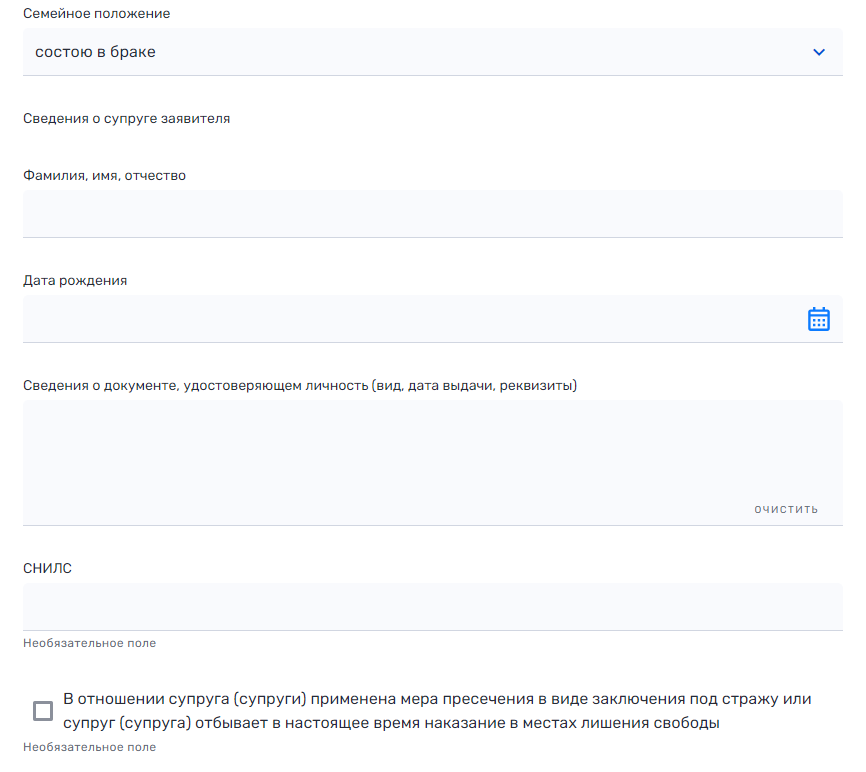 При выборе семейного положения «состою в браке» заполните сведения о супруге: