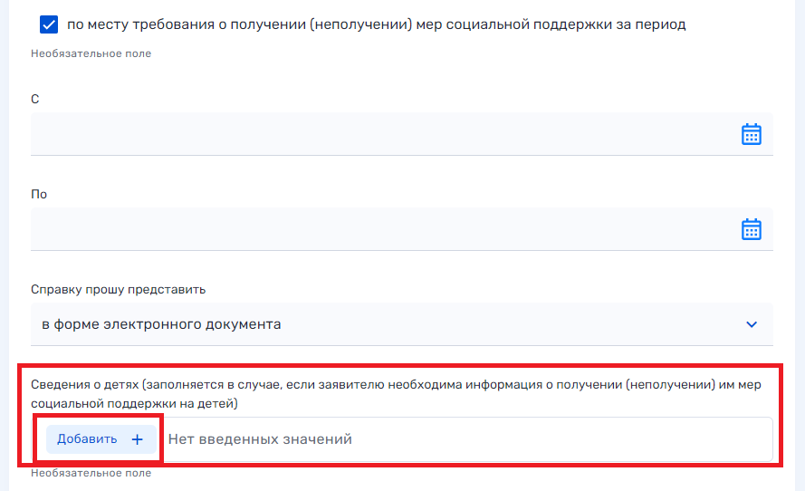 6.1. Обратите внимание, при выборе «по месту требования о получении (неполучении) мер социальной поддержки за период» появляется строка «сведения о детях». Прочитайте пояснение в каком случае нужно заполнять сведения и если это относится к вашей ситации нажмите «Добавить». Заполните появившиеся строки.