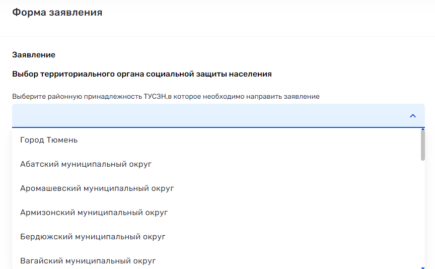 4. В выпадающем списке выберите Территориальное Управление Социальной Защиты Населения (ТУСЗН).
