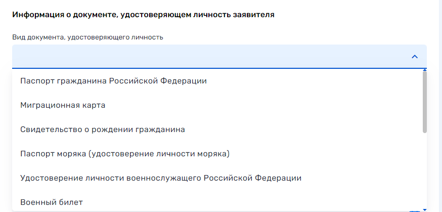 В выпадающем списке выберите вид документа, удостоверяющего личность. Если данные в личном кабинете госуслуг заполнены они автоматически подтянутся, проверьте их корректность.