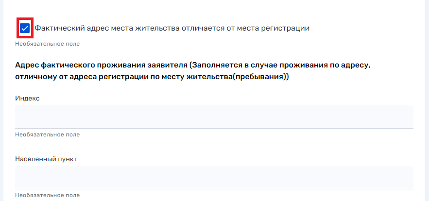 5. Проверьте автоматически заполненную информацию в блоке «Сведения об адресе». Если вы проживаете не по адресу регистрации, внизу блока выберите чек-бокс «Фактический адрес места жительства отличается от места регистрации» и заполните появившиеся ниже строки.