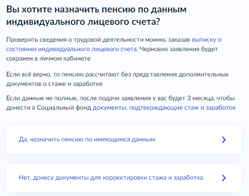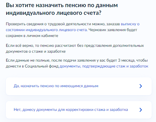 12. Выберите хотели бы вы назначить пенсию на основании имеющихся данных вашего индивидуального лицевого счёта?
