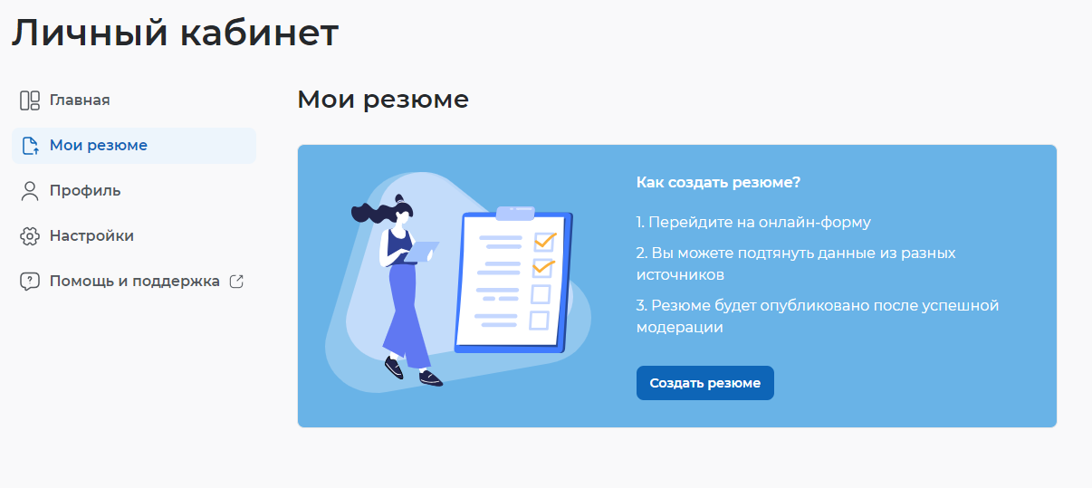 - После авторизации Вы окажетесь в Личном кабинете. Для составления резюме перейдите по кнопке "Мои резюме", далее "Создать резюме":