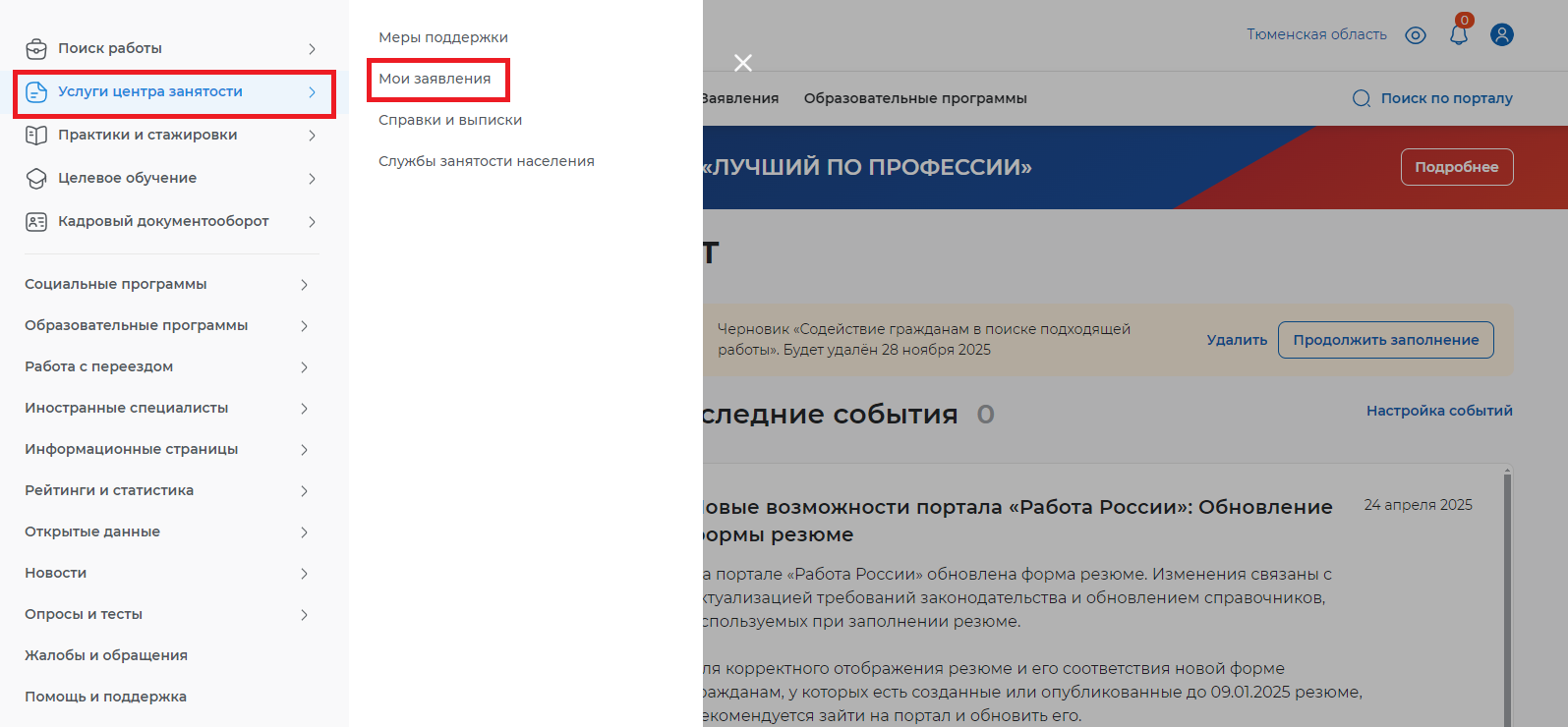 , "Услуги центра занятости" и выберите "Мои заявления".