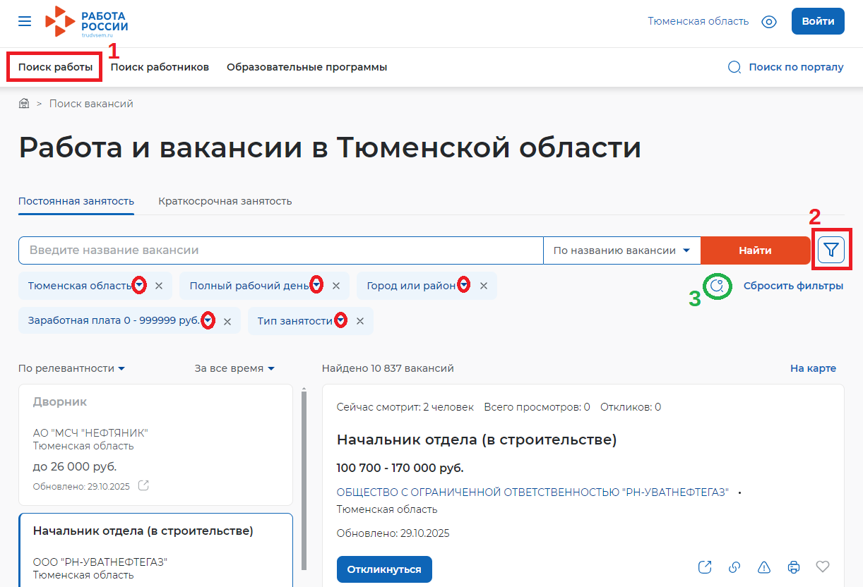 На вкладке "Поиск работы" (1) можно ознакомиться с размещенными на платформе вакансиями, авторизация для этого не нужна.