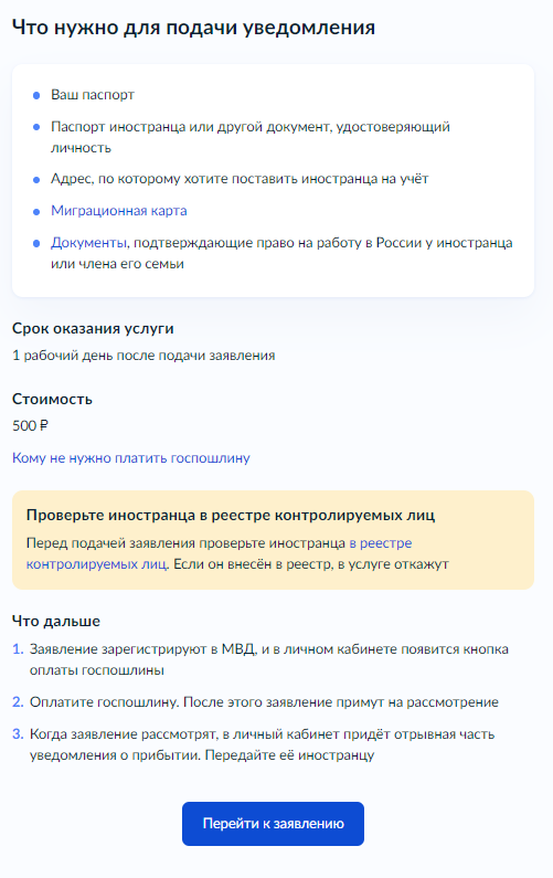 Если уведомление о прибытии было подано через портал, нажмите «Да». Далее ознакомьтесь со списком необходимых для подачи уведомления документов и переходите к подаче заявления.