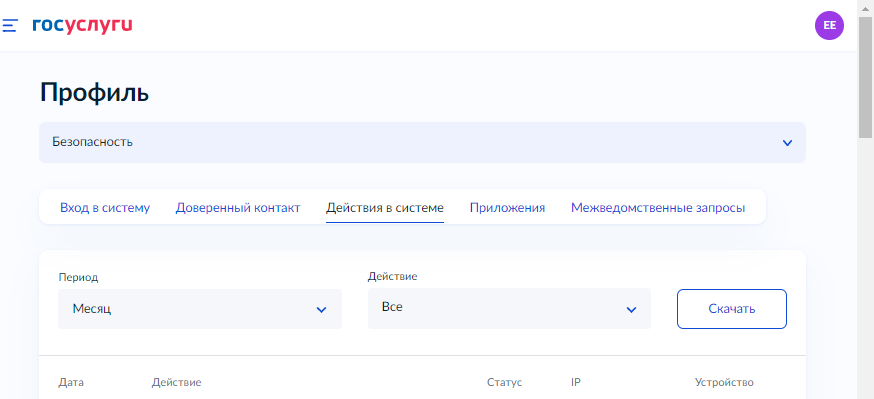 5. В правом верхнем углу нажмите на свою иконку, далее профиль. Проверьте в разделе «Безопасность» на вкладке «Действия в системе»