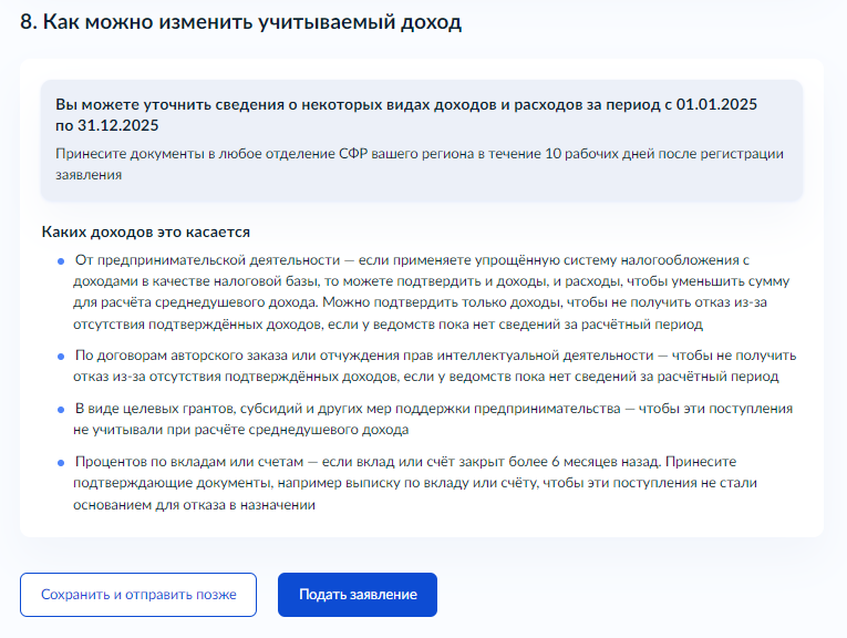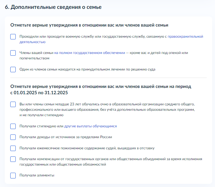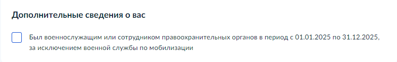 Обратите внимание! По необходимости, проставьте отметку в чек-боксе, если Вы были военнослужащим или сотрудником правоохранительных органов с 01.01.2025 по 31.12.2025, за исключением военной службы по мобилизации.