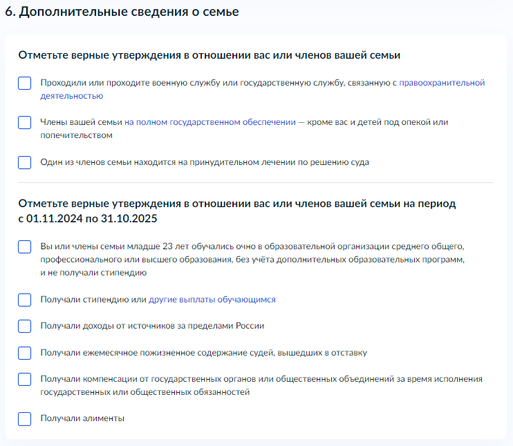 Обратите внимание! По необходимости, проставьте отметку в чек-боксе, если Вы были военнослужащим или сотрудником правоохранительных органов с 01.11.2024 по 31.10.2025, за исключением военной службы по мобилизации.