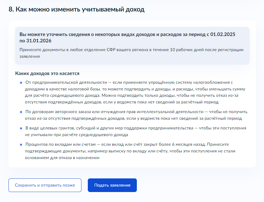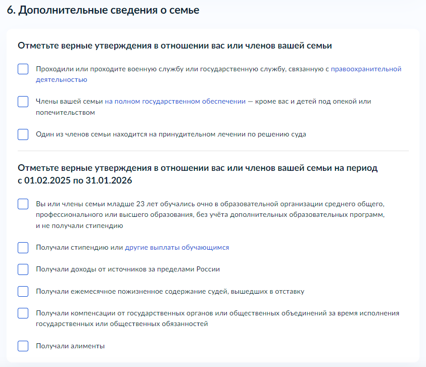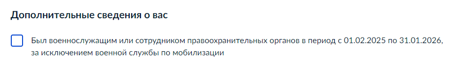 Обратите внимание! По необходимости, проставьте отметку в чек-боксе, если Вы были военнослужащим или сотрудником правоохранительных органов с 01.02.2025 по 31.01.2026, за исключением военной службы по мобилизации.