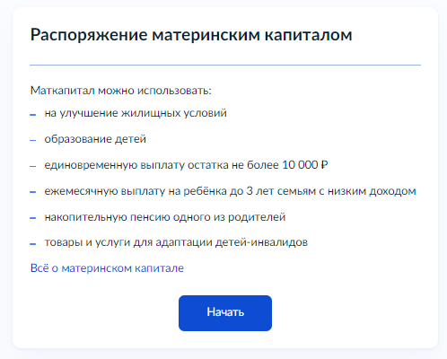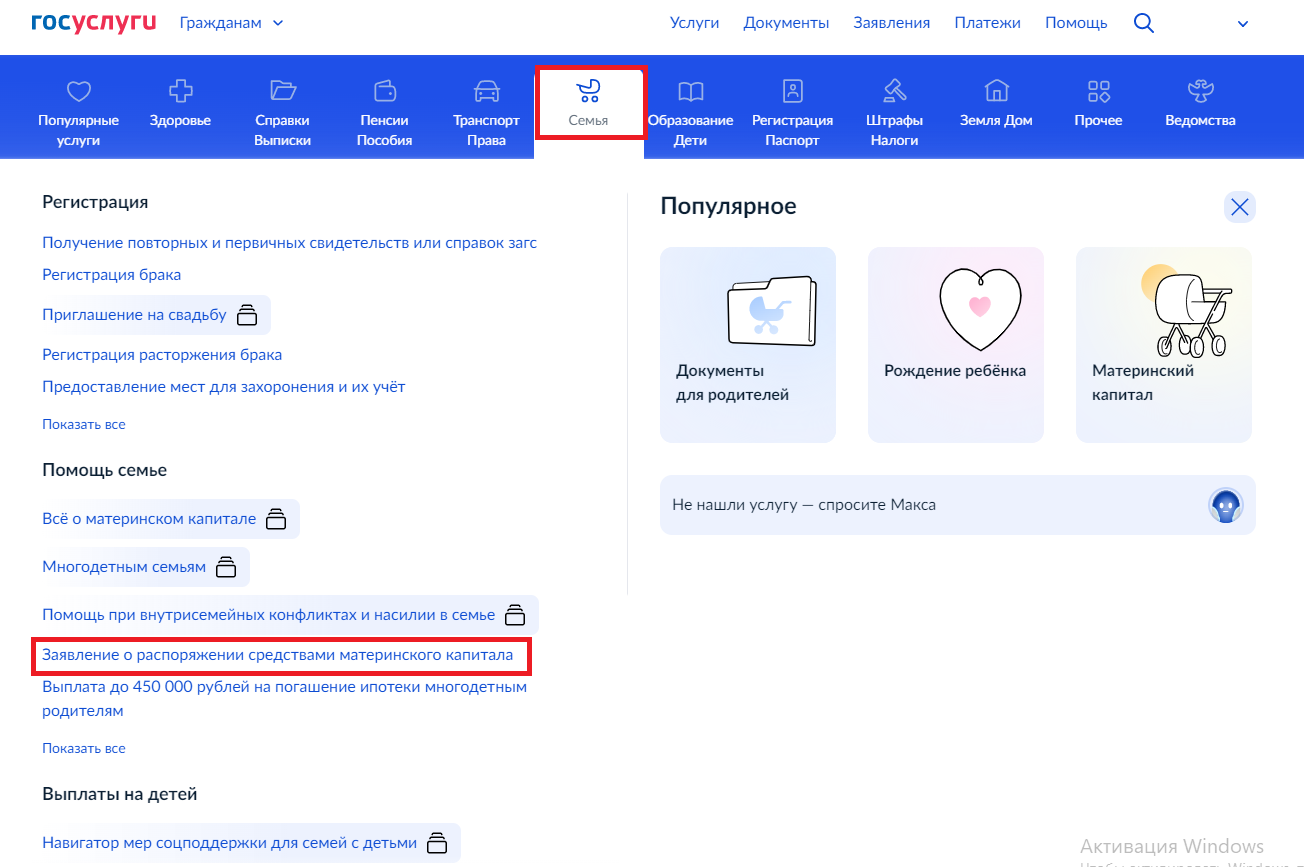 1. Откройте раздел «Семья», выберите услугу «Заявление о распоряжении средствами (частью средств) материнского (семейного) капитала» либо перейдите по ссылке на услугу: https://www.gosuslugi.ru/600121/1/form
