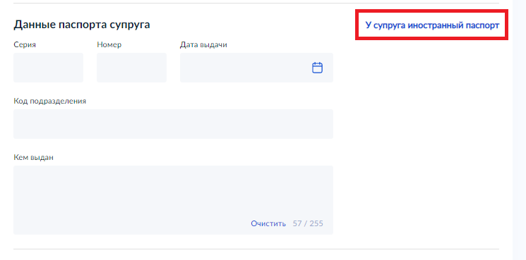 Обратите внимание! Если у супруга иностранный паспорт нужно нажать соответствующую кнопку, чтобы появились соответствующие поля для заполнения.