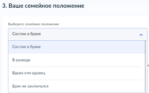 7. Выберите Ваше семейное положение, заполните сведения о супруге и его паспортных данных.