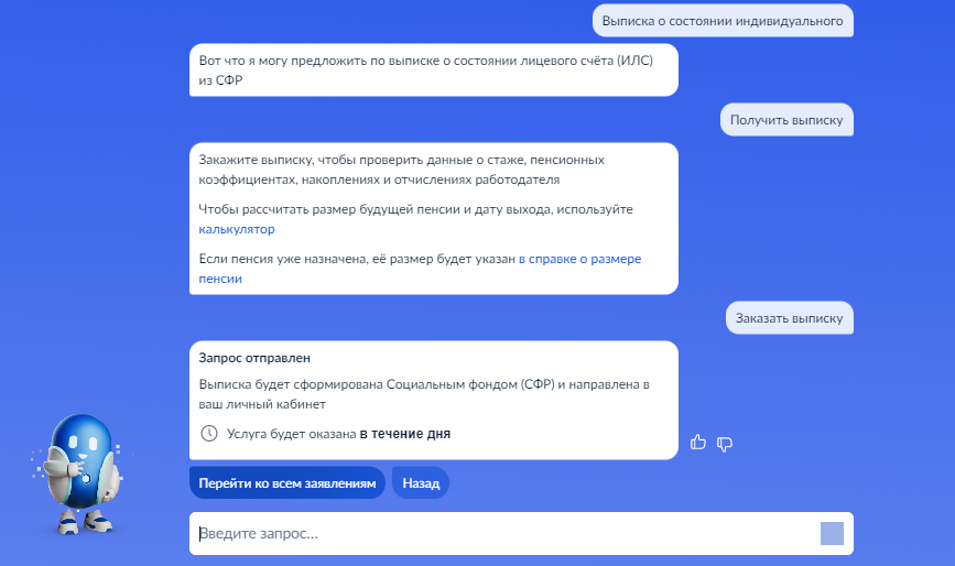 3. Закажите на Госуслугах Выписку о состоянии индивидуального лицевого счёта с помощью голосового помощника и проверьте сведения о трудовой деятельности. Если всё верно, пенсию можно рассчитать без дополнительных документов о стаже и заработке.
