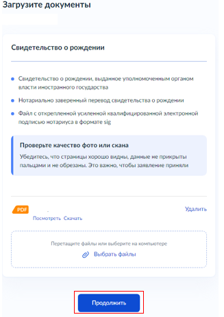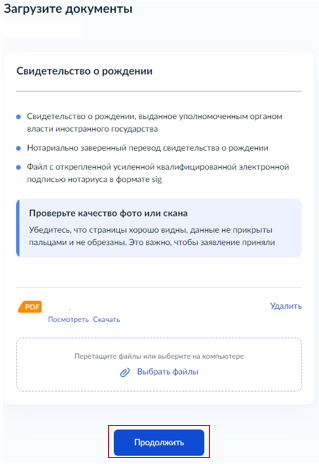Если рождение ребенка зарегистрировано "За границей", укажите реквизиты свидетельства о рождении, а затем загрузите необходимые документы.
