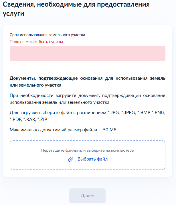 7. Укажите срок использования земельного участка. При необходимости загрузите документ, подтверждающий основание использования земель или земельного участка.