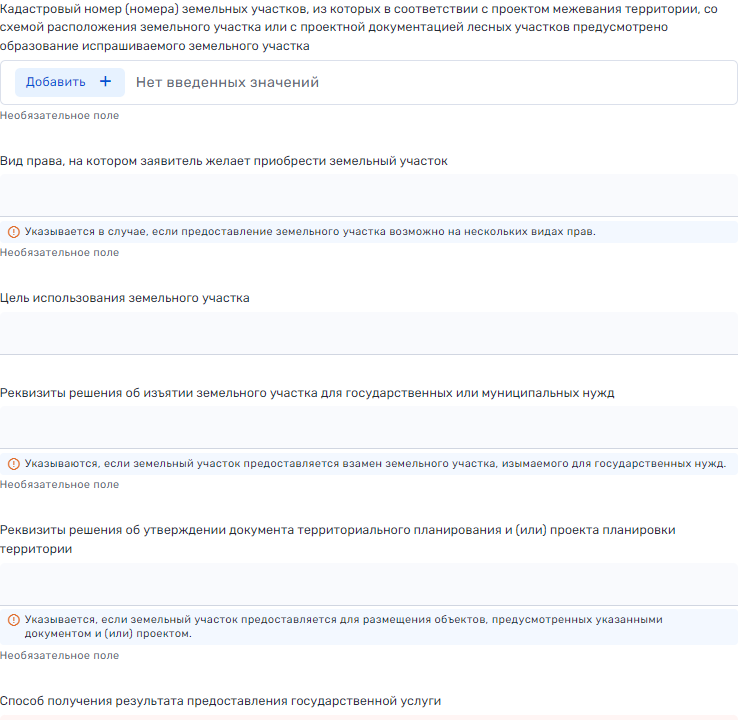 Выберите, что нужно предварительно согласовать, кадастровый номер (нажать на "добавить+"), способ получения результата, и направления уведомлений, примечания или иные документы, если имеются дополнительные сведения и т.д.