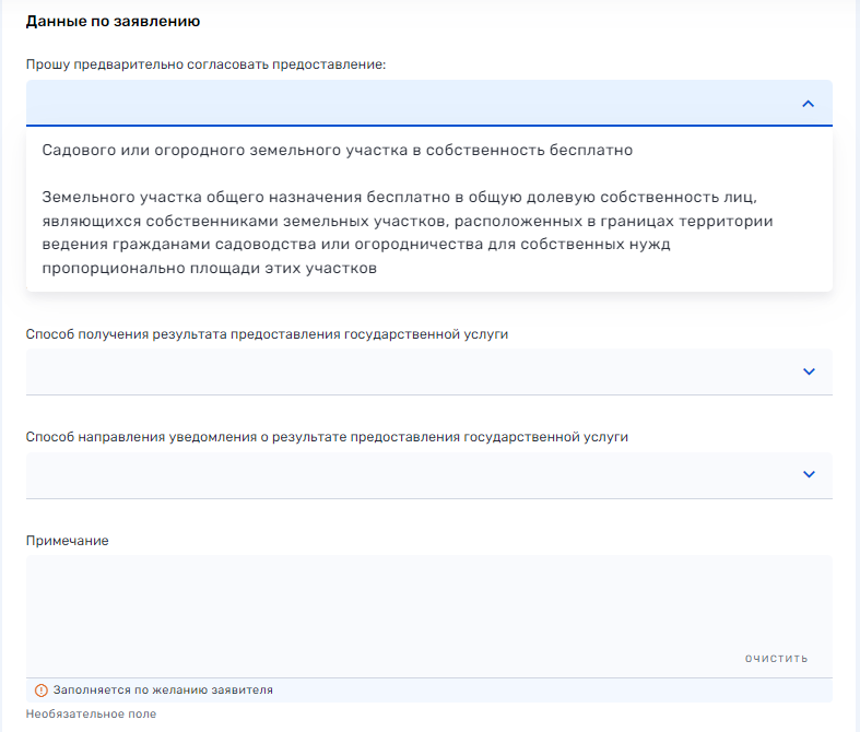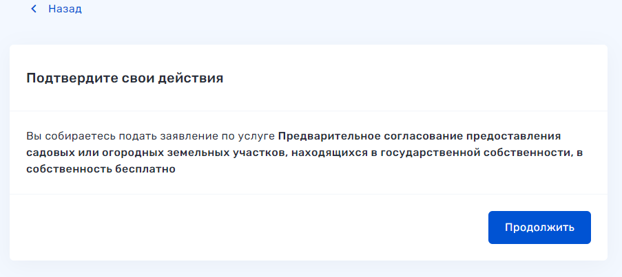 4. Если вы подаете заявление "Решение о предварительном согласовании предоставления земельного участка в общую долевую собственность бесплатно" нажмите продолжить.