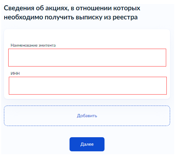 При выборе «Акции» необходимо заполнить блок «Сведения об акциях, в отношении которых необходимо получить выписку из реестра».