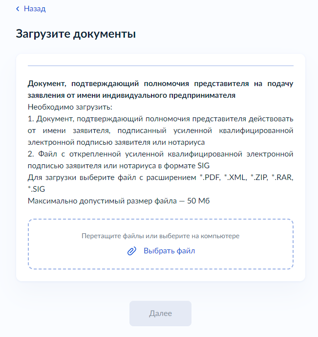 При получении услуги представителем заявителя потребуется прикрепить документ, подтверждающий полномочия представителя, подписанный УКЭП лица, выдавшего доверенность, а также файл с открепленной УКЭП в формате SIG.