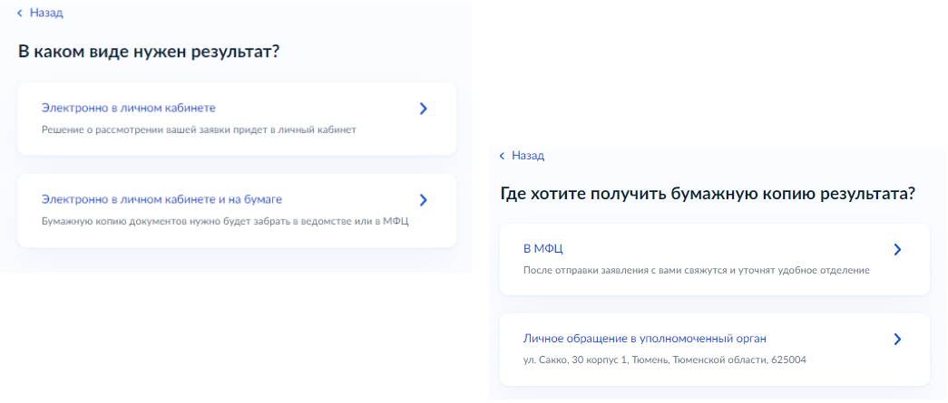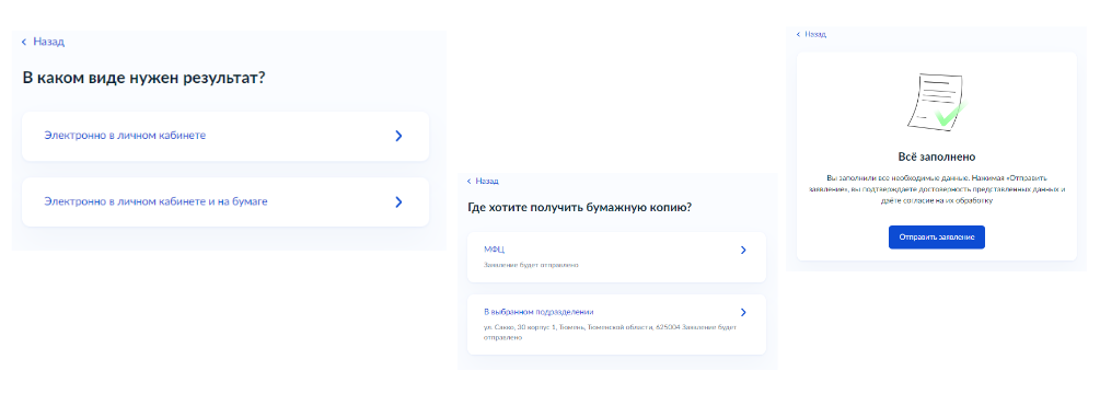 7. Выберите необходимое подразделение и форму получения результата. Нажмите кнопку «Отправить заявление».