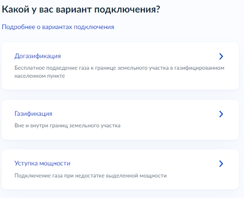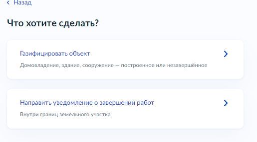 4. Для бесплатного подведения газа к границам земельного участка выберите «Газифицировать объект», затем выберите вариант подключения «Догазификация».
