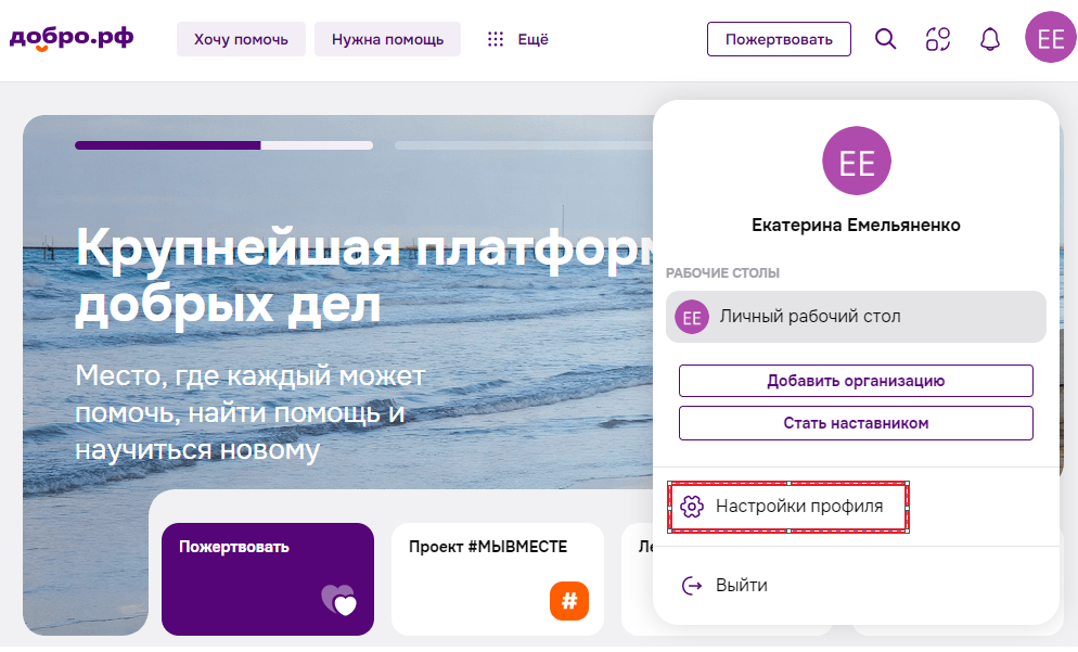 В случае отсутствия профиля на портале ДОБРО.РФ необходимо там зарегистрироваться.