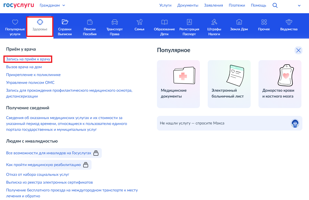 Услугу также можно найти в разделе «Здоровье» в верхнем меню на главной странице Портала.