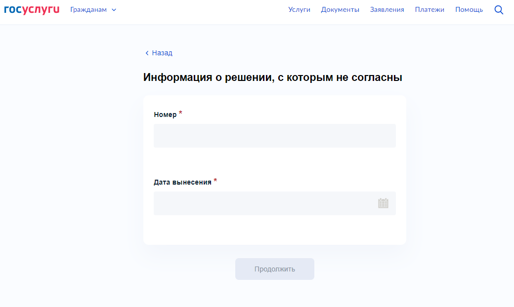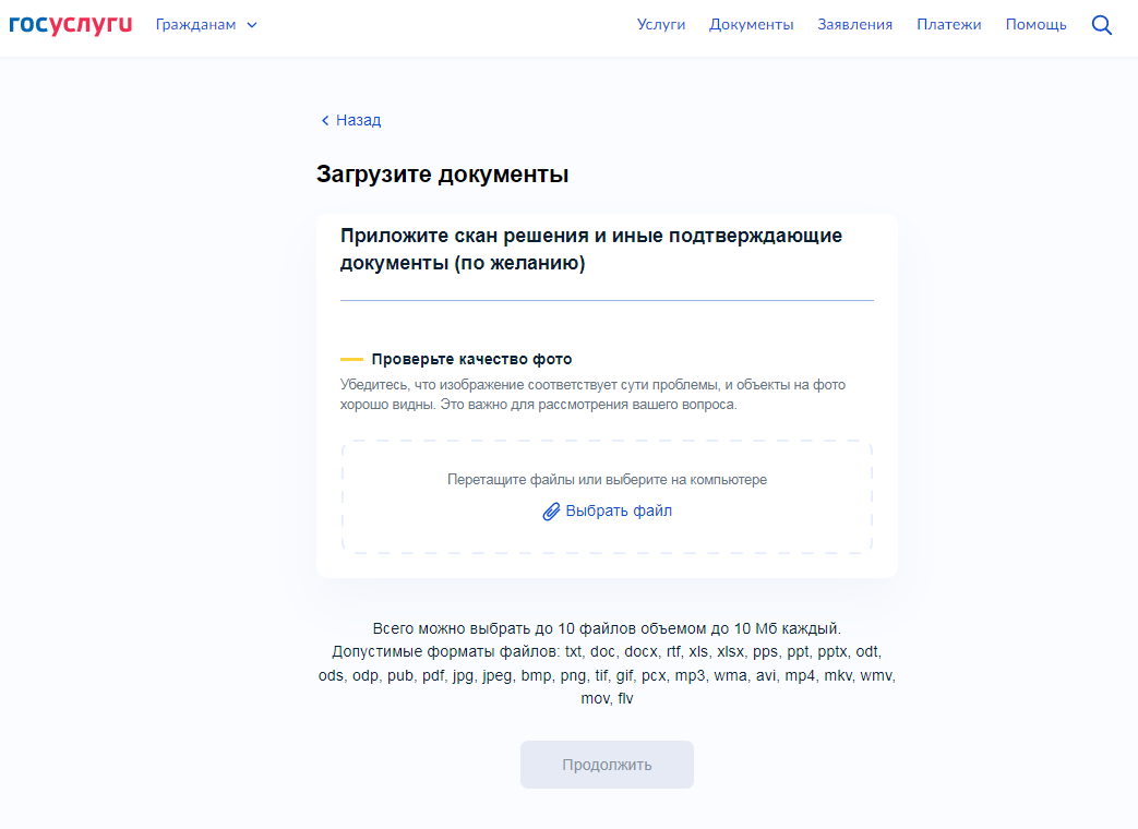 10. Загрузите документы необходимые для рассмотрения обращения - приложите скан решения и иные подтверждающие документы (по желанию) и нажмите «Продолжить».