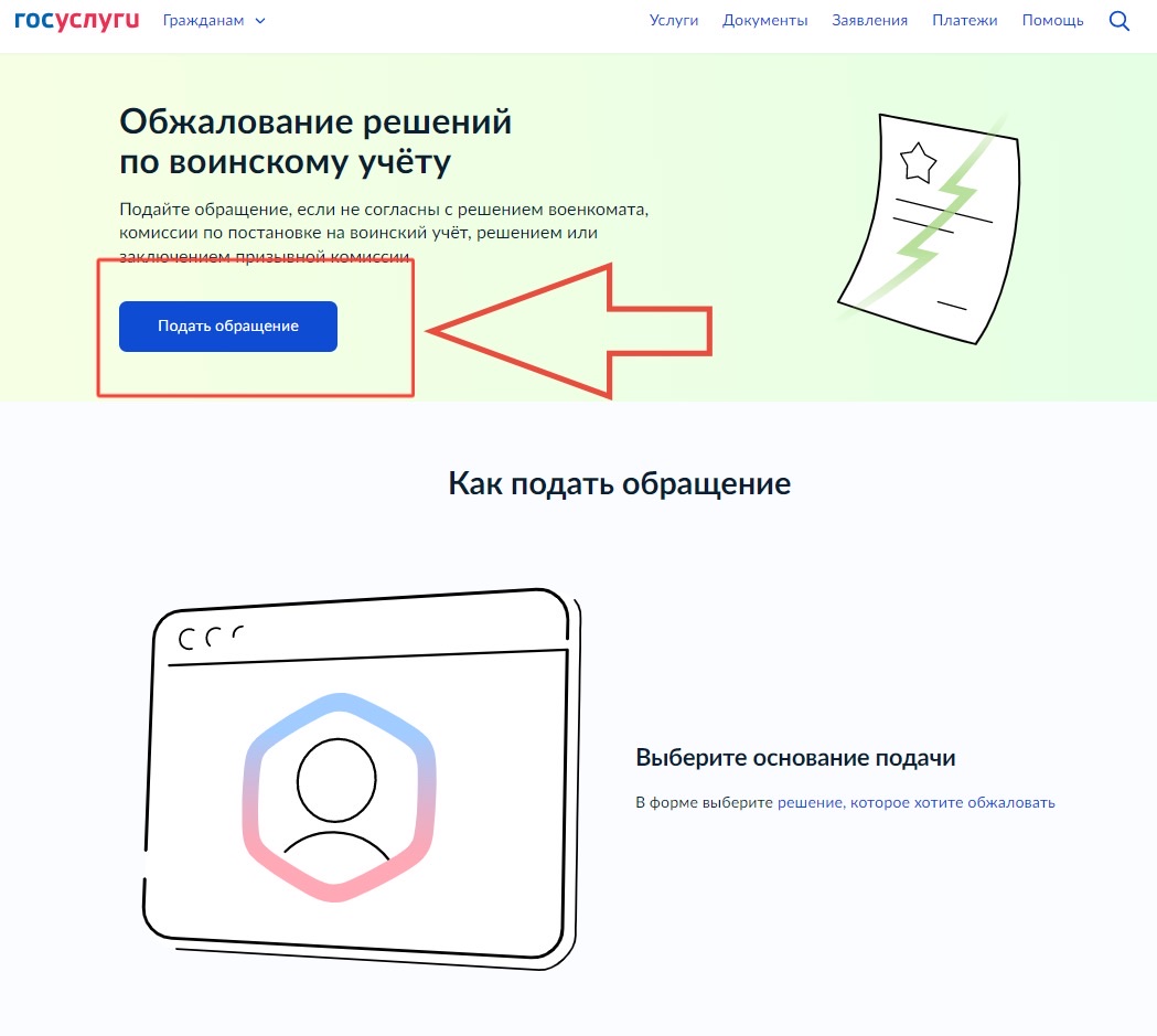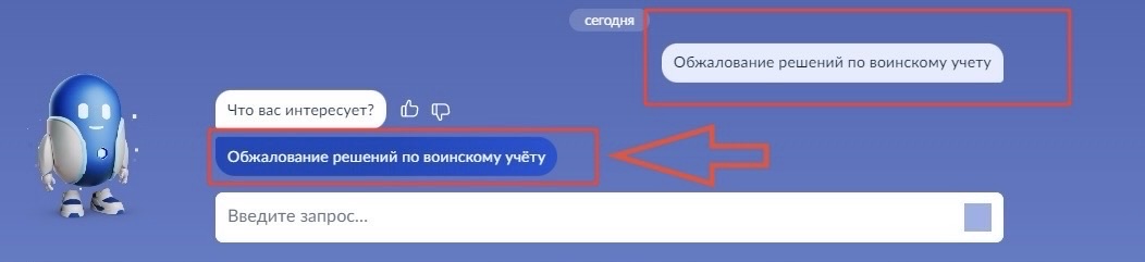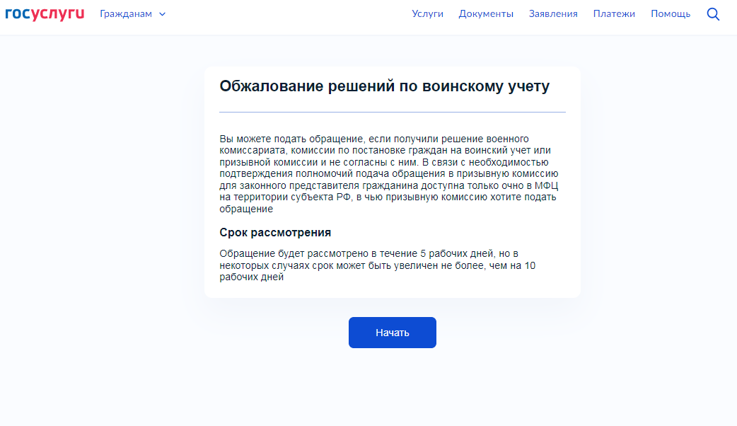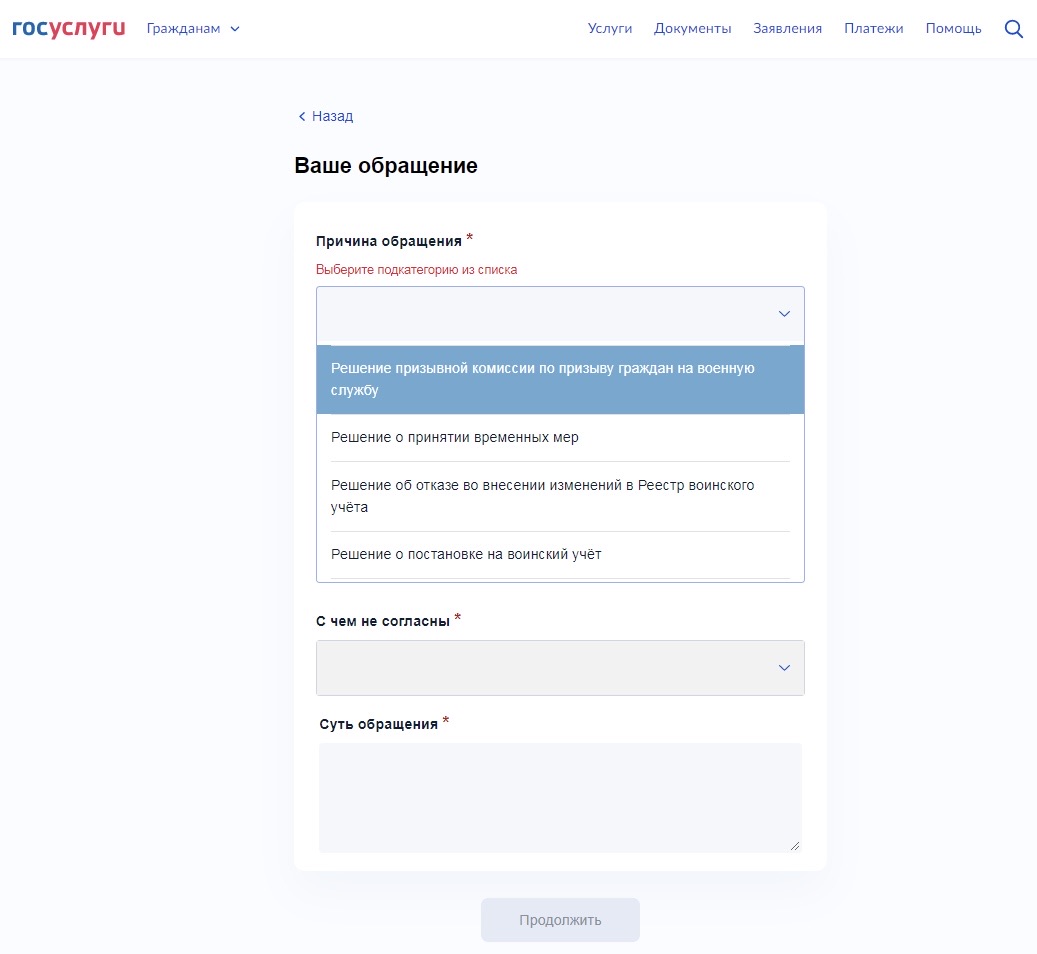Услугу также можно найти через поиск по ключевым словам «Обжалование решений по воинскому учёту».