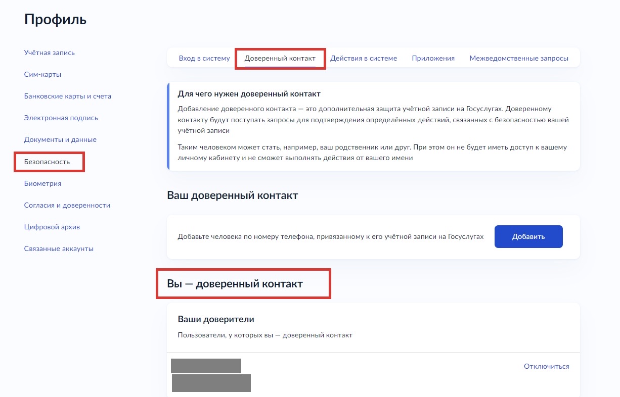 Данные закрепленного доверенного контакта в учетной записи доверителя можно проверить в профиле доверителя.
