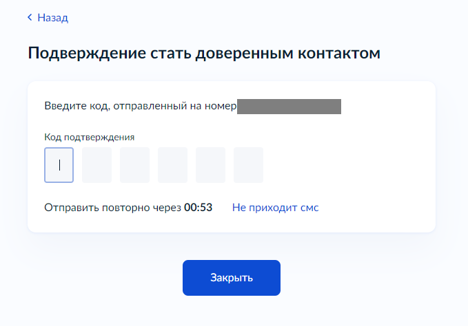 Подтвердить свое согласие также необходимо введением кода, который поступит в виде смс-оповещения на номер телефона, указанный в учетной записи на портале госуслуг доверенного контакта.
