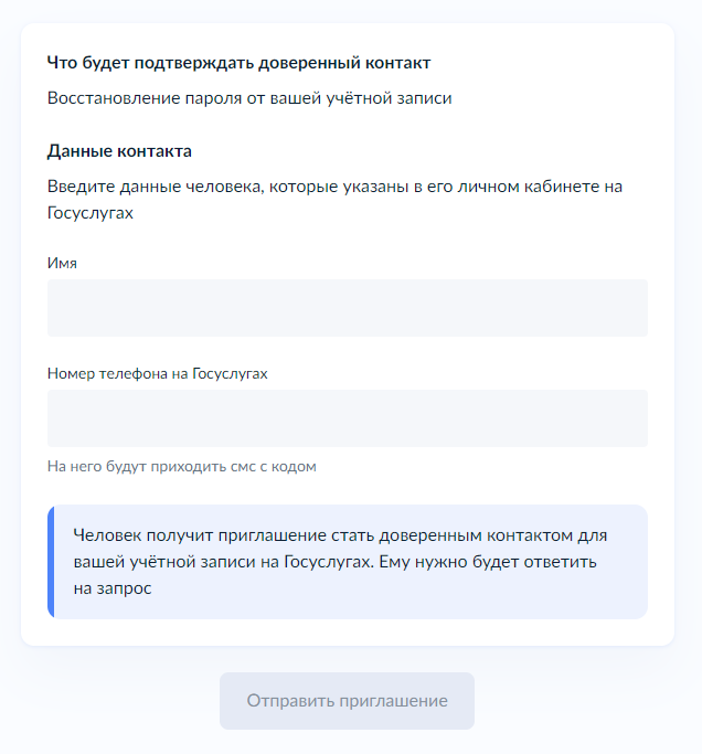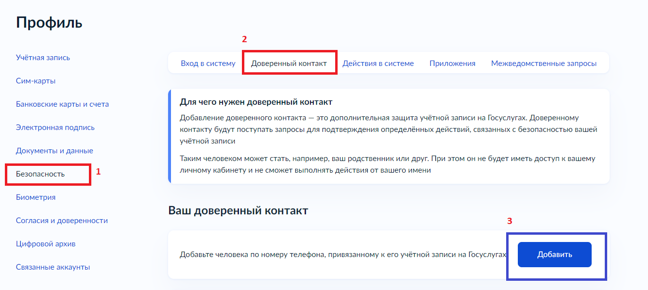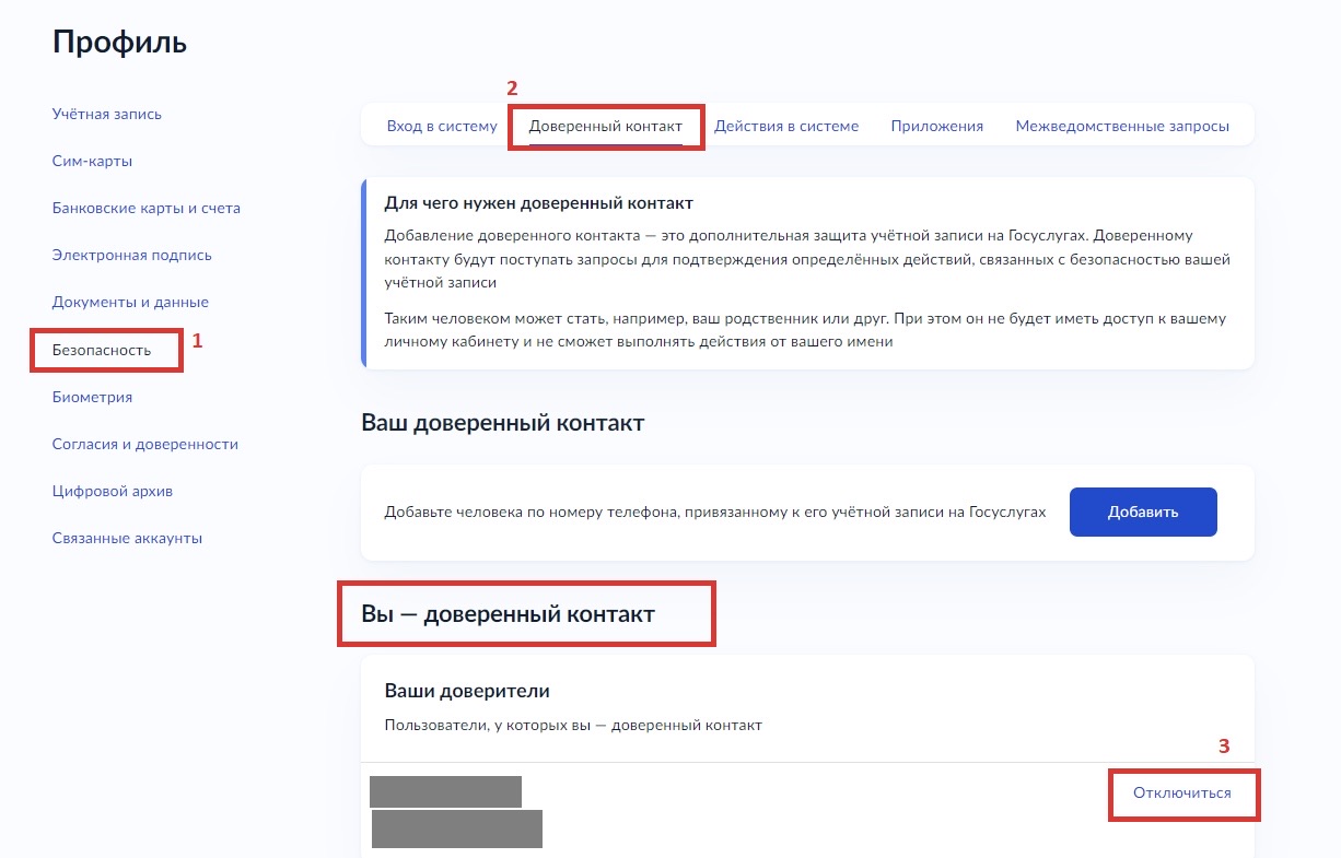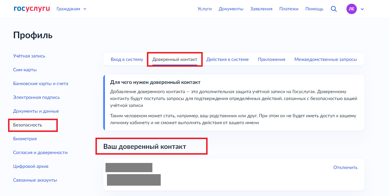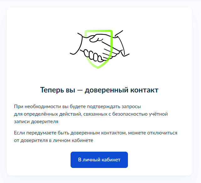 При этом доверенный контакт не будет иметь доступ к вашему личному кабинету и не сможет выполнять действия от вашего имени. Отключить или заменить доверенный контакт можно в любое время. В одну учетную запись можно добавить только один доверенный контакт.