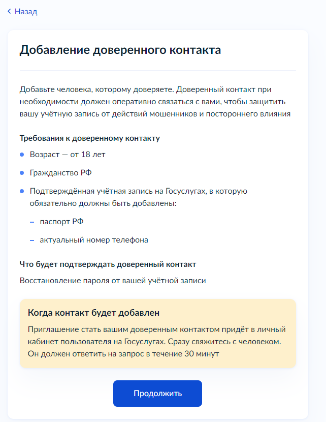4. Ознакомьтесь с требованиями к тому, кто может быть доверенным контактом. Выберите подходящего человека, которому вы доверите эту роль, и предупредите его для оперативного ответа на запрос в его учетной записи на портале госуслуг. Нажмите «Продолжить».
