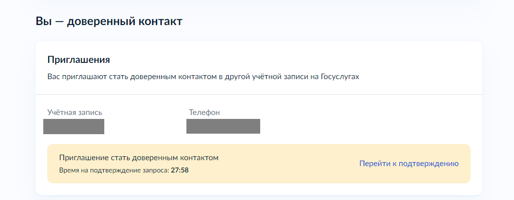 6. В учетную запись доверенного контакта придет уведомление о том, что приглашение поступило. После нажатия на данное оповещение нужно подтвердить свое согласие на то, чтобы стать доверенным контактом для конкретного лица. Для этого следует нажать клавишу «Перейти к подтверждению».